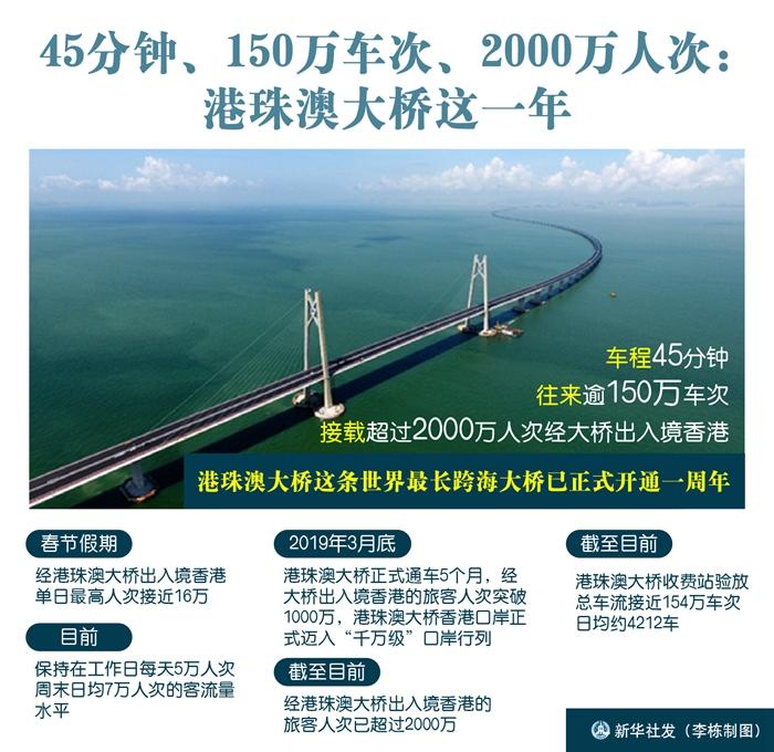 新华社香港10月24日电(记者朱宇轩 方栋)车程45分钟,往来逾150万车次,接载超过2000万人次经大桥出入境香港……港珠澳大桥虹起伶仃,飞架三地,这条世界最长跨海大桥已正式开通一周年。