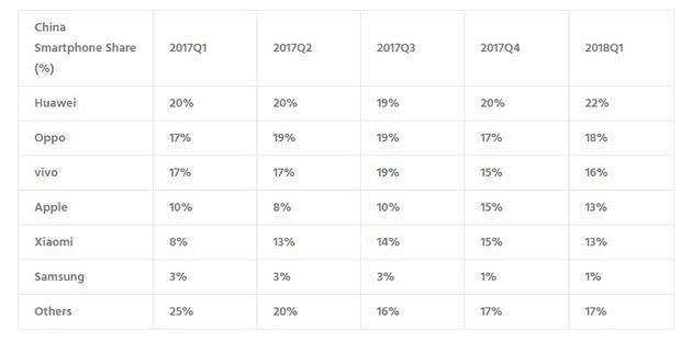 中国智能手机市场2017第一季度至2018第一季度排行榜。Counterpoint数据