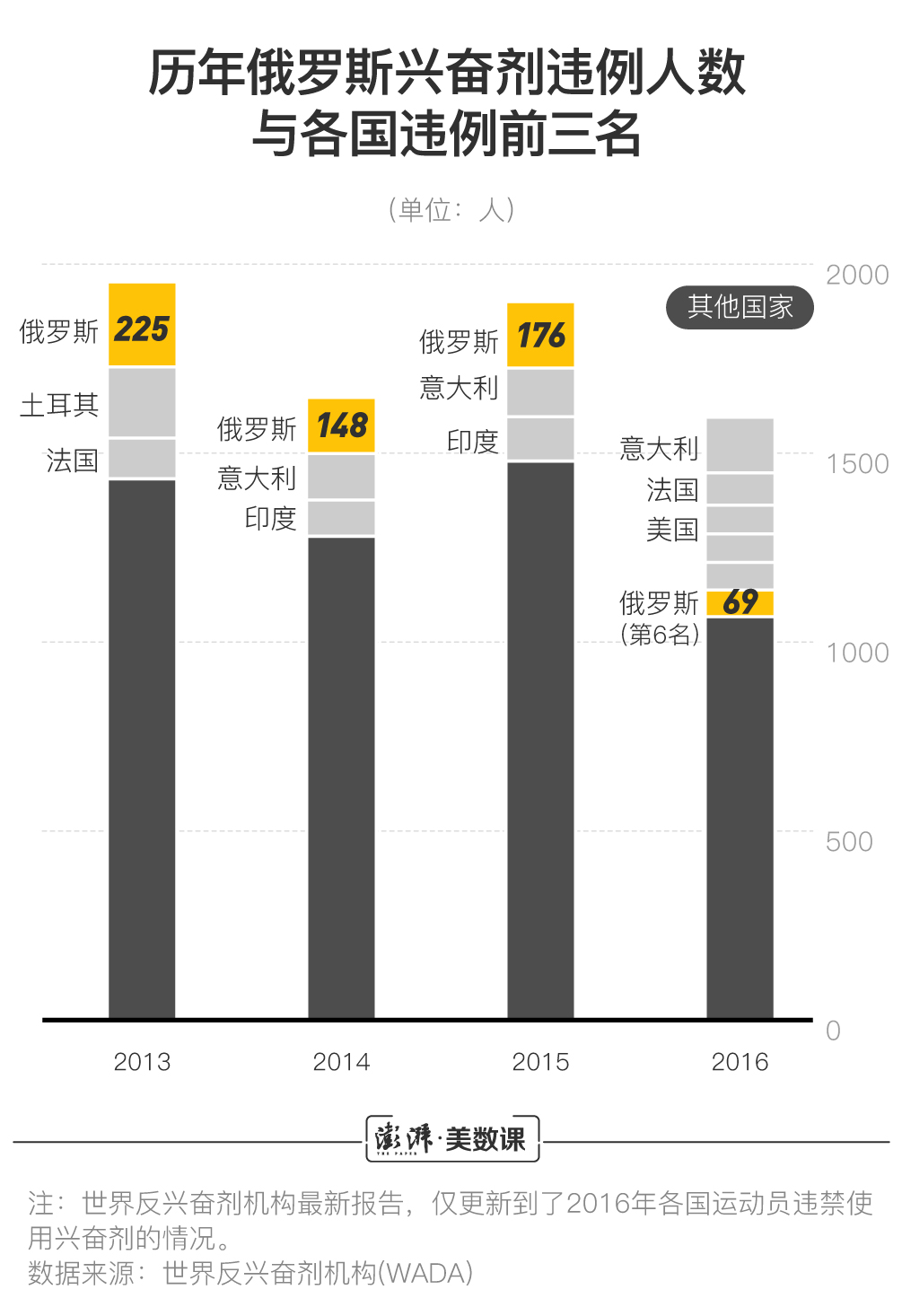 近年来世界反兴奋剂机构所发布的《兴奋剂使用违例报告》显示。2013年-2015年,在世界反兴奋剂机构组织各国反兴奋剂机构(如中国为CHINADA,俄罗斯为RUSADA)与单项国际体育协会(如国际足联等)每年对超过20万运动员的药物检测中,俄罗斯运动员违例人数均为世界第一。但去年四月的最新报告中显示,2016年俄罗斯违例人数为世界第6。 违例人数前三名的国家为意大利、法国、美国。