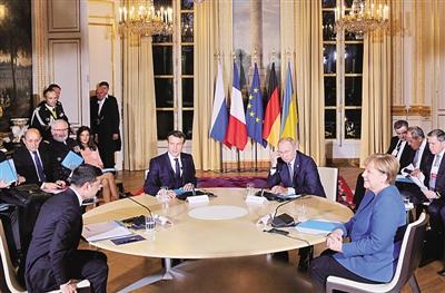12月9日,在法国巴黎,(从左到右)乌克兰总统泽连斯基、法国总统马克龙、俄罗斯总统普京和德国总理默克尔出席“诺曼底模式”四国峰会。新华社发