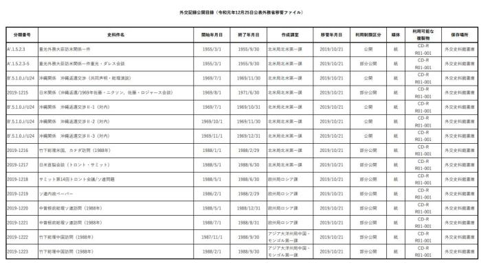 日本外务省25日公开的外交文件目录。来源:日本外务省网站截图。
