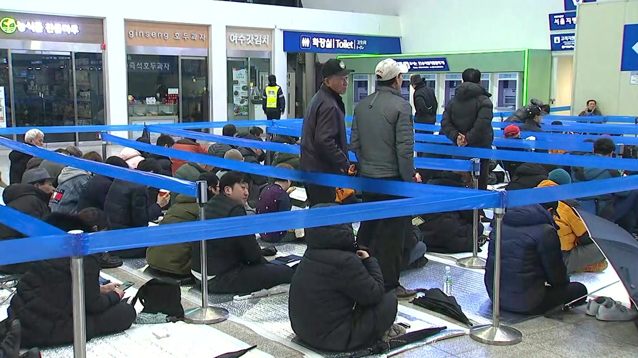 6日下午,韩国市民在首尔火车站打地铺购票(韩联社)