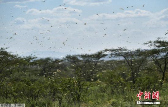 图为当地时间2020年1月21日,在肯尼亚Archers Post附近的拉里索罗村,蝗虫飞过灌木丛。