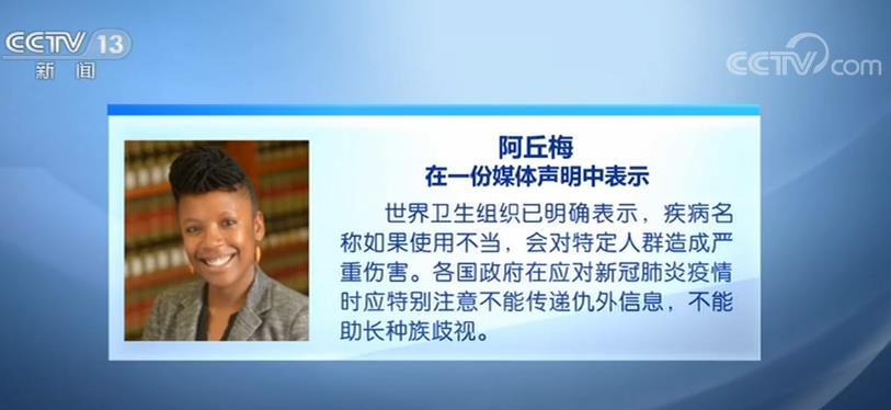阿丘梅在一份媒体声明中表示,世界卫生组织已明确表示,疾病名称如果使用不当,会对特定人群造成严重伤害。各国政府在应对新冠肺炎疫情时应特别注意不能传递仇外信息,不能助长种族歧视。