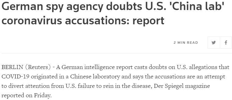 路透社5月8日援引德国《明镜》周刊的报道称,德国联邦情报局在一份报告中质疑了美国有关“新冠病毒源自中国一家实验室”的说法。
