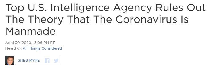 美国情报机构早就排除了病毒是人造的可能性。美国国家情报局局长办公室4月30日在官方网站上发布声明,称情报界同意科学界的广泛共识,即新冠病毒不是人造的,也未经过基因改造。