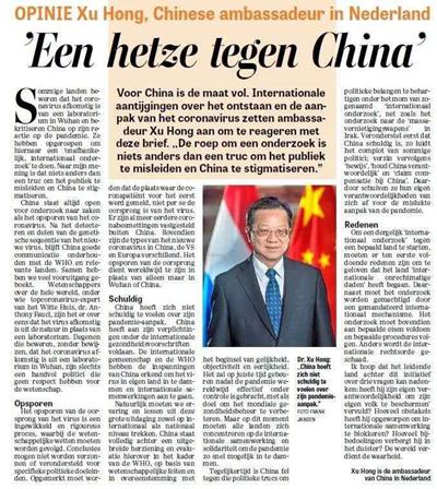 5月12日,荷兰《电讯报》以“政治操弄涉疫情‘国际调查’的把戏可以休矣”为题刊发中国驻荷兰大使徐宏的评论文章。(《电讯报》版面截图)