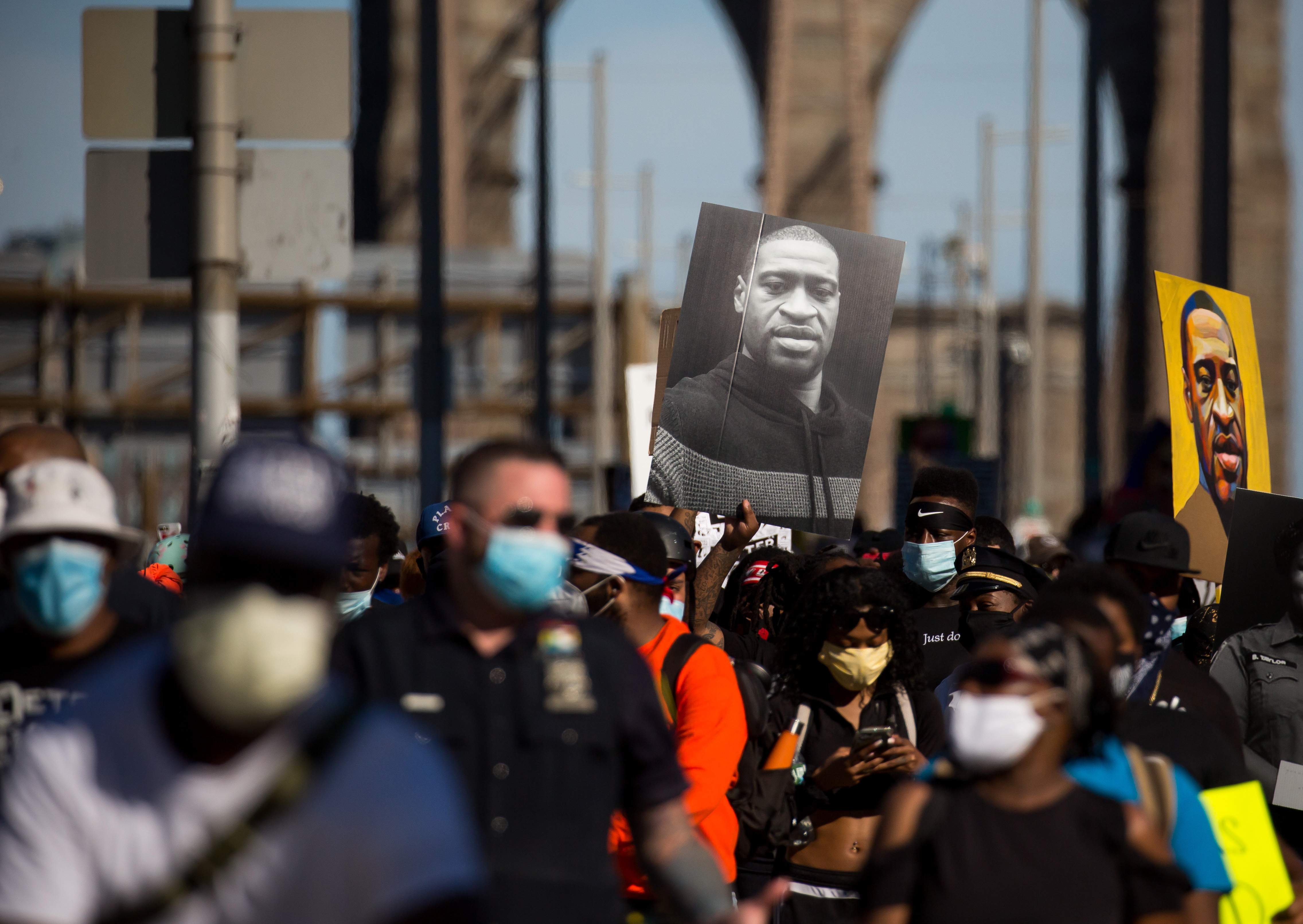 6月13日,抗议者手举弗洛伊德的肖像通过美国纽约布鲁克林大桥。(新华社发,迈克尔·内格尔摄)