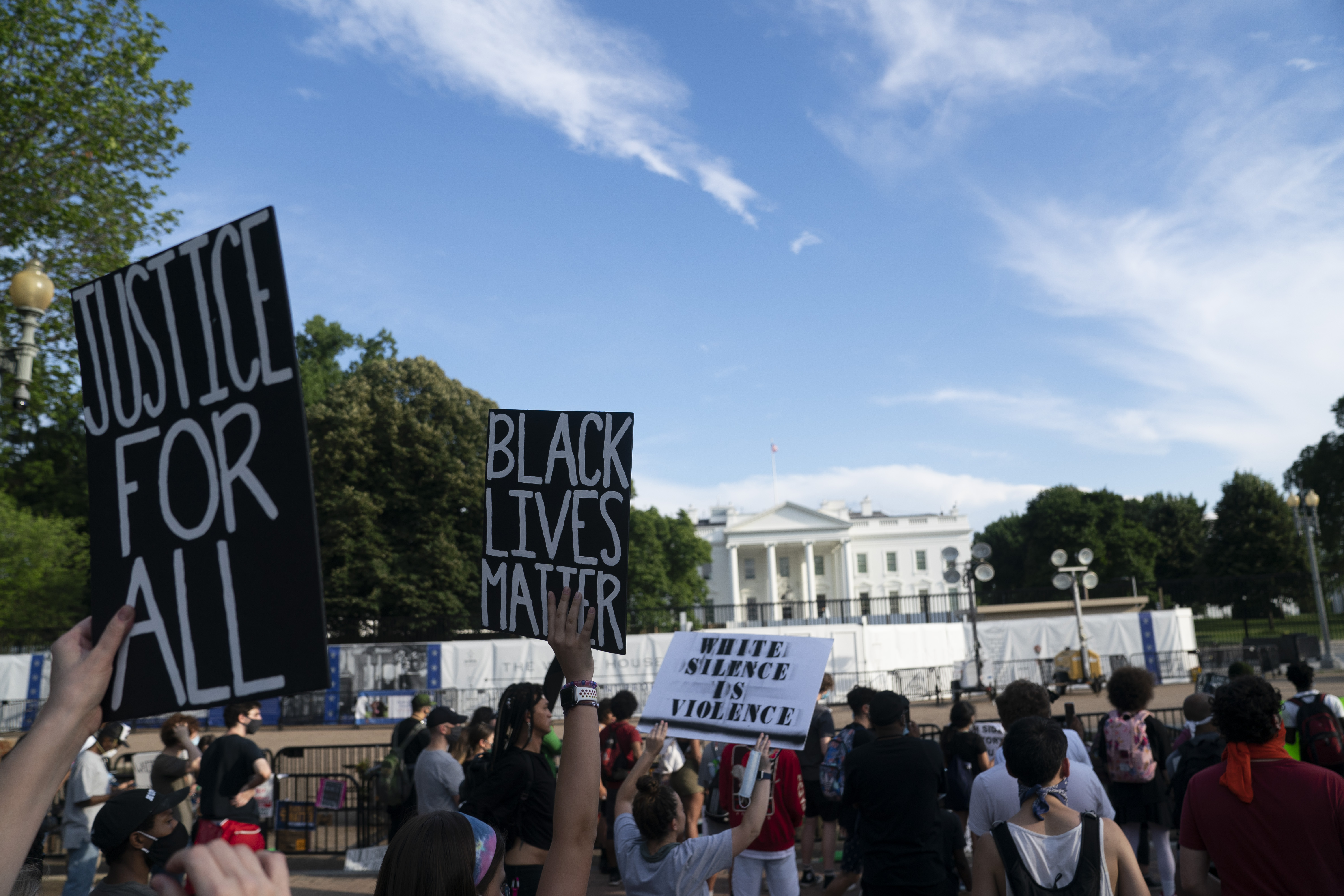 在华盛顿市中心,数以千计的民众在时断时续的雨中一边行进,一边高呼着弗洛伊德的名字以及“黑人的命也是命”等口号。部分示威者聚集在白宫前的宾夕法尼亚大道上,呼喊着“停止给警察拨款”等口号抗议警方暴力执法。