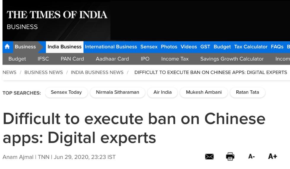 《印度时报》报道称,一些数字技术专家表示,对中国应用执行禁令将很困难。因为这需要互联网服务提供商(ISP)将每一个与这些应用程序有关的主机名和域名列入黑名单,还需要谷歌和苹果公司从其商店中删除这些应用程序。