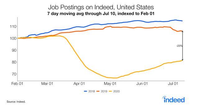民间的一些数据更能说明找工作的难度。据招聘网站Indeed的数据,截至7月10日发布的岗位需求数量比2019年同期减少约23%,旅游住宿等行业的岗位需求更是“蒸发”掉了50%以上。