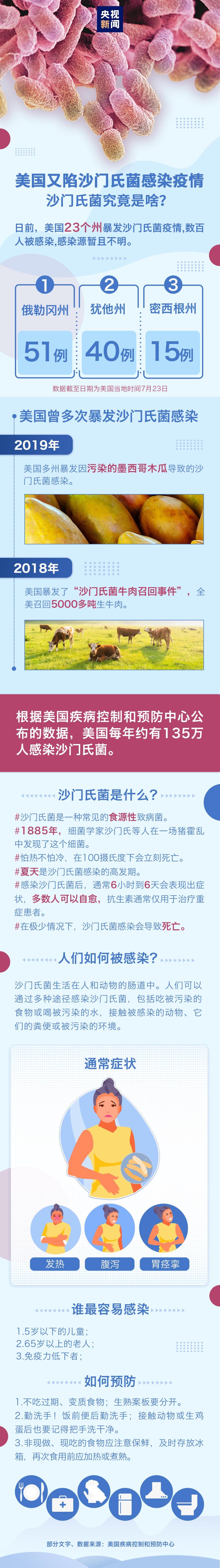 当地时间25日,美国《国会山报》报道称,美国疾病控制和预防中心正在调查波及23个州的沙门氏菌感染疫情。该机构称,截至当地时间7月23日,已有212人感染沙门氏菌,感染源暂不明确。沙门氏菌究竟是啥?如何预防沙门氏菌感染?带你一图看懂。