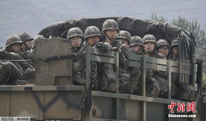 资料图:韩国陆军士兵乘卡车前行。
