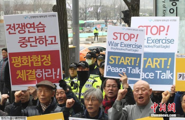 资料图:当地时间2016年3月7日,韩国民众在美国驻韩国大使馆前举行反战集会,抗议韩美举行的“关键决心”和“秃鹫”联合军事演习。