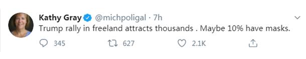 在当天的总统竞选集会现场,据《纽约时报》记者凯西·格雷在个人社交媒体上称,“特朗普的竞选集会在弗里兰聚集了数千人,但戴口罩的人却连10%都不到。”