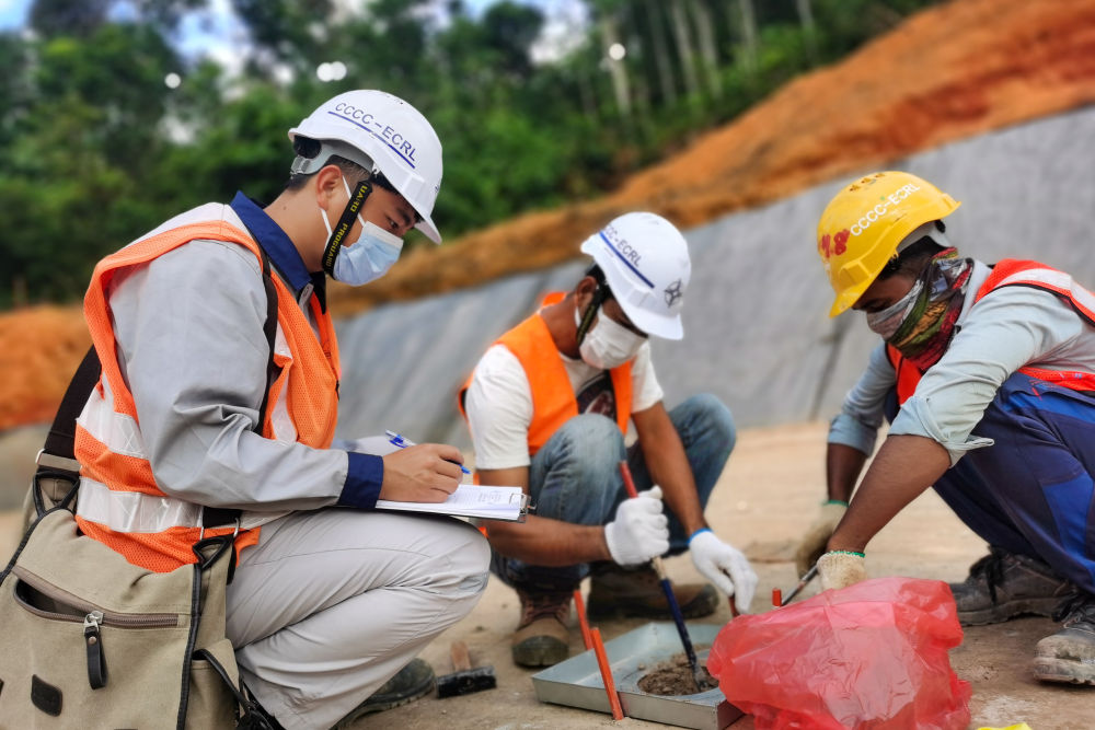 9月30日,在马来西亚丁加奴州北加镇的中国交通建设集团有限公司承建马来西亚东海岸铁路(东铁)项目施工现场,技术员刘志欣(左)与属地员工一起工作。(新华社发)