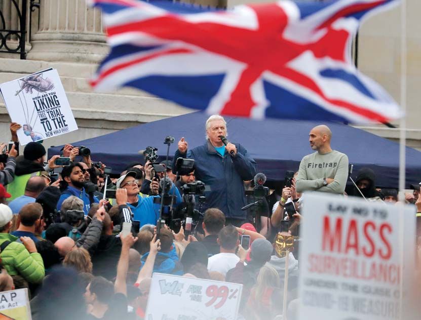 9 月 28 日,在英国特拉法加广场,阴谋理论家大卫·伊克在一场集会上发表演讲,该集会的目的是抗议新冠肺炎疫情的相关限制措施