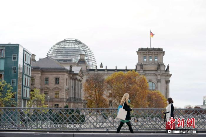 图为16日下午,两名戴口罩的女士从德国国会大厦旁的桥上经过。中新社记者 彭大伟 摄