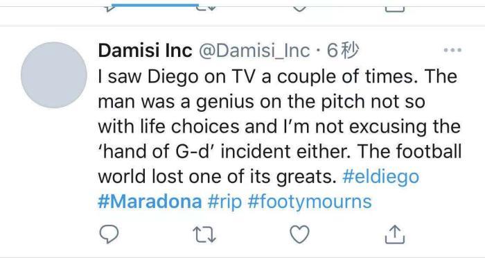 还有人说道,马拉多纳没有亲眼看到阿根廷再次捧起大力神杯,这会是他永远的遗憾。