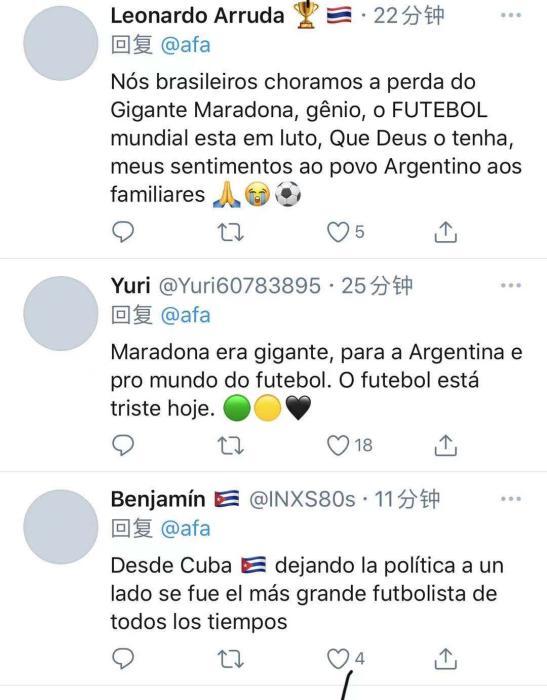 即使是阿根廷队死敌巴西的球迷,也在这一刻怀念这位他们曾经痛恨的老对手。一位巴西球迷表示,虽然自己是一个巴西人,但还是还是要在这一刻拥抱所有阿根廷球迷,他们失去了这个世界上最伟大的球星。