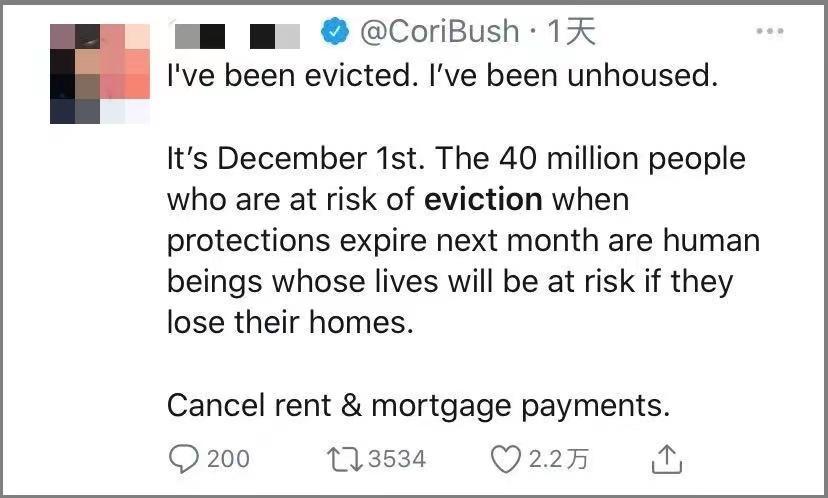 “我被驱逐了,我无家可归。”这条仅发出半天就获得2.2万关注及3500多条转发的推特写道,“12月1日,四千万人将被驱逐,失去住所的他们面临生命危险。”写下这篇推文的是一名国会议员,而她所说的“驱逐”,正成为美国媒体及社交平台上的热词被频频提及。