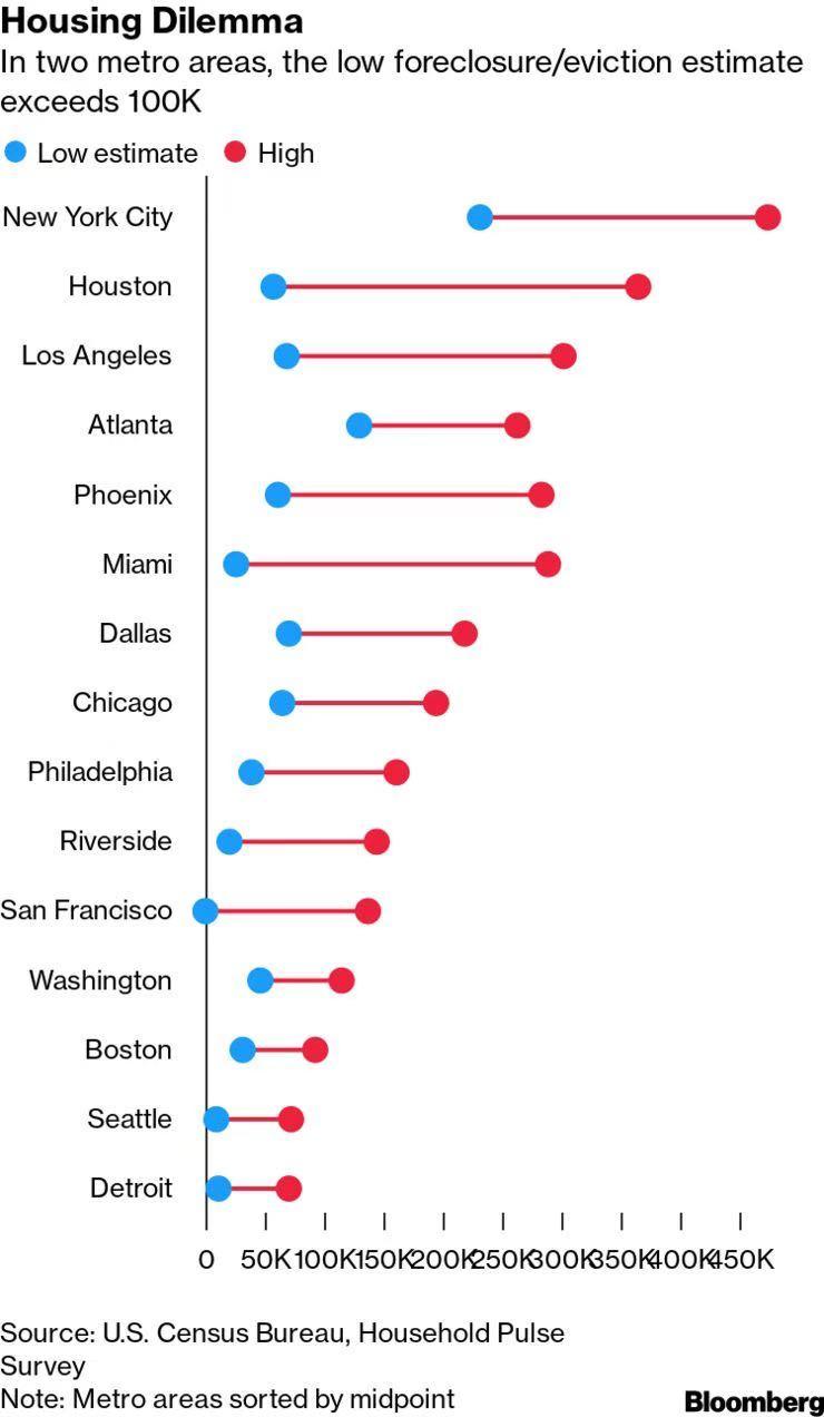 在阿肯色州、佛罗里达州和内华达州,大约有一半的家庭没有按时支付房租或抵押贷款,他们在明年1月前被驱逐的可能性很大。这意味着超过75万个家庭将被驱逐。在纽约、休斯敦和亚特兰大,驱逐的威胁更为紧迫。