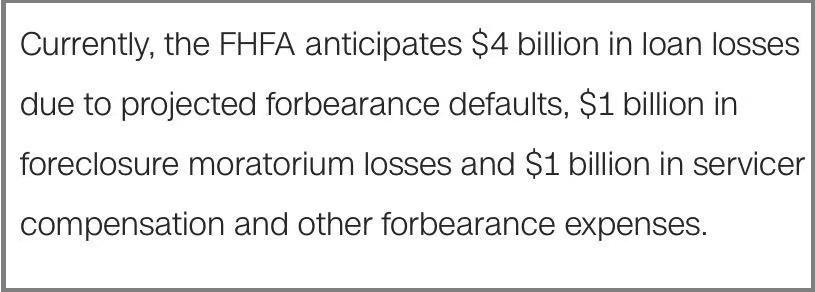 FHFA给出了详细的预估数字:由于贷款延期、贷款违约等,损失为40亿美元,止赎延期损失为10亿美元,服务商补偿和其他延期费用为10亿美元。