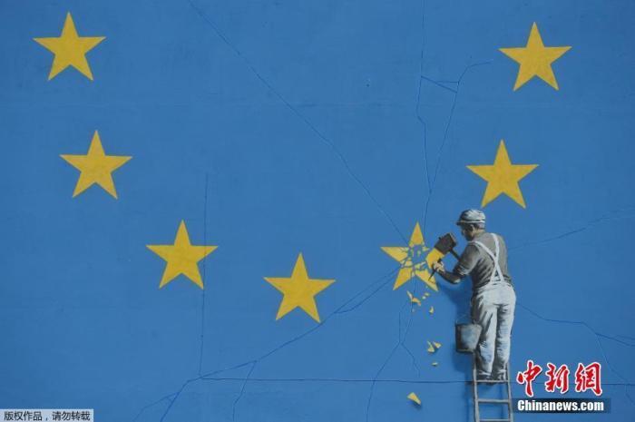 资料图:英国涂鸦艺术家班克西创作了一幅画,画面中一名工人正从欧盟12星旗帜上抹掉一颗星,寓意着英国将脱离欧盟。
