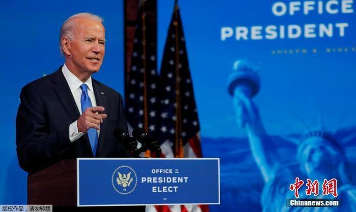 当地时间2020年12月14日,美国选举团正式确认拜登在2020年美国总统大选中击败特朗普后,美国当选总统拜登在特拉华州威尔明顿皇后剧院的过渡总部发表电视讲话。