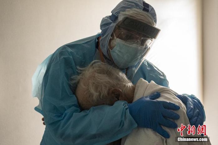 当地时间2020年11月26日,美国休斯敦,联合纪念医疗中心的医生约瑟夫·瓦龙在感恩节期间拥抱并安慰新冠肺炎重症监护室(ICU)的一名患者。图片来源:视觉中国