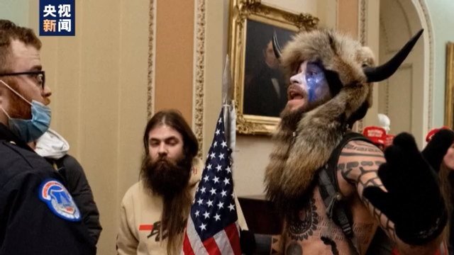 打扮成“野蛮人”形象的男子杰克·安杰利也是“匿名者Q”组织的成员,有不少追随者。“匿名者Q”是一个美国极右翼阴谋论组织。