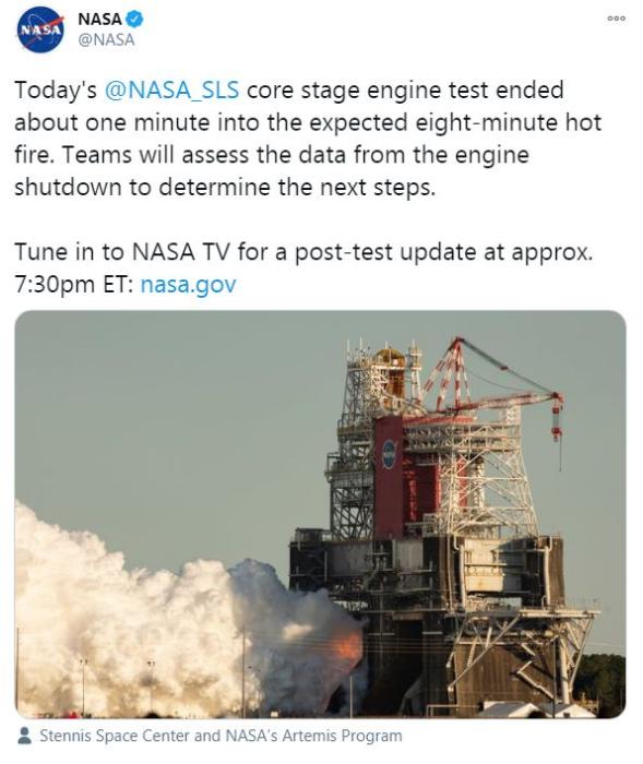 原本NASA希望火箭上的4个发动机能持续发动485秒(8分多钟),但最后火箭核心节的4个发动机却仅点燃1分钟,测试草草结束。