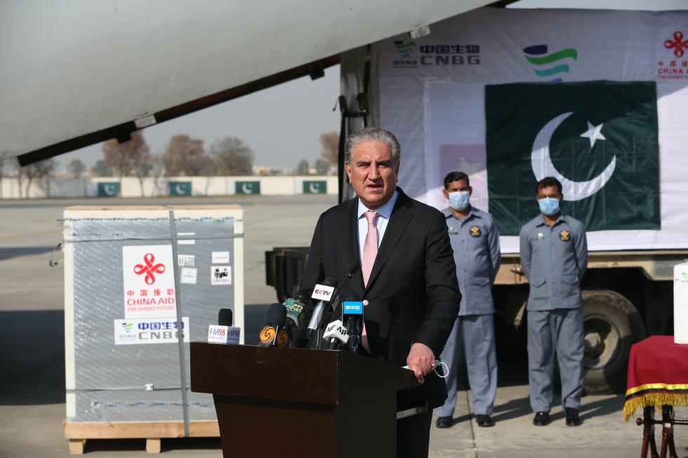 ↑2月1日,在巴基斯坦首都伊斯兰堡附近的努尔汗空军基地,巴外长库雷希在疫苗交接仪式上讲话。