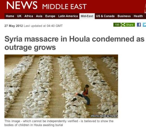 BBC使用的照片是意大利摄影师马可·迪拉罗(Marco di Lauro)2003年3月拍摄的。从照片上看,一名伊拉克小女孩在数十个白色装尸袋间蹦跳玩耍,这些尸体都是在巴格达南部沙漠中发现的。但是BBC新闻网站却将其冠以“众怒声中叙利亚胡拉屠杀升级”的标题。BBC称,这张照片是一位活动家提供的,他们无法独立对其进行核实。他们误以为这张照片上的尸体是胡拉屠杀受害者在等待下葬。