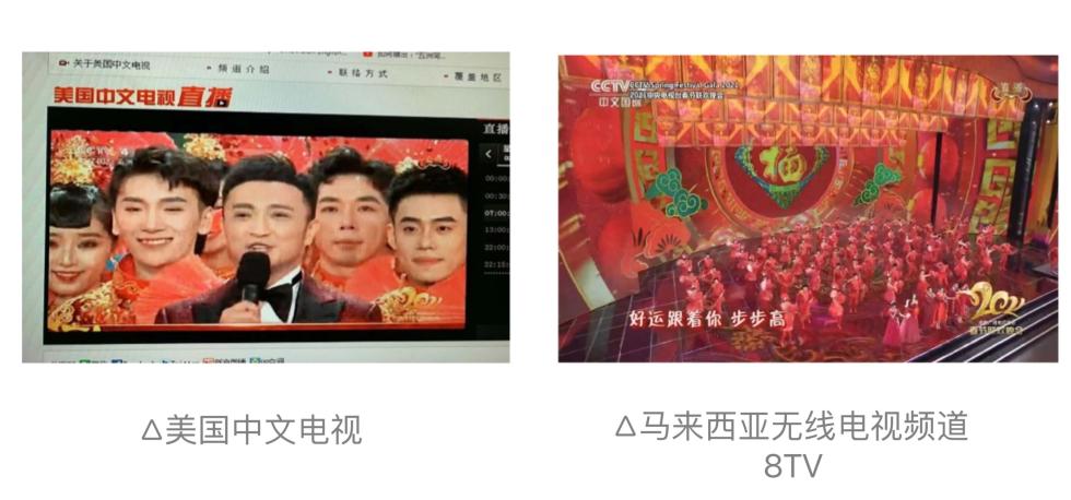 春晚新闻素材被CNN、美国之音、西班牙国家电视台、俄罗斯中心电视台、日本广播公司、巴西旗手传媒集团 、意大利广播电视公司、西班牙国家电视台、俄罗斯第一频道、日本NHK、南非广播公司 等多家境外电视台/频道采用。