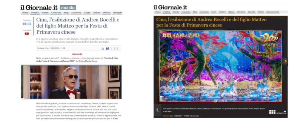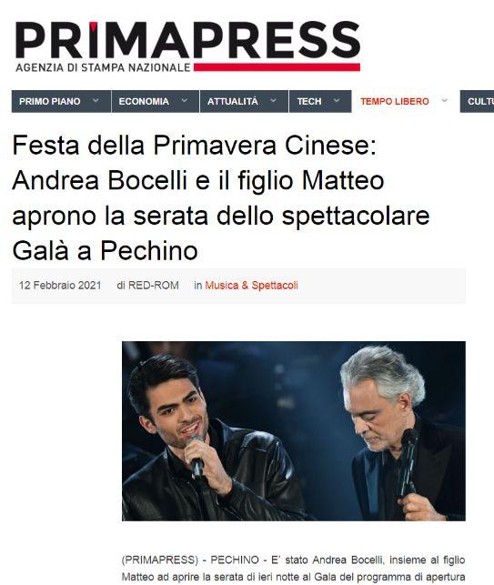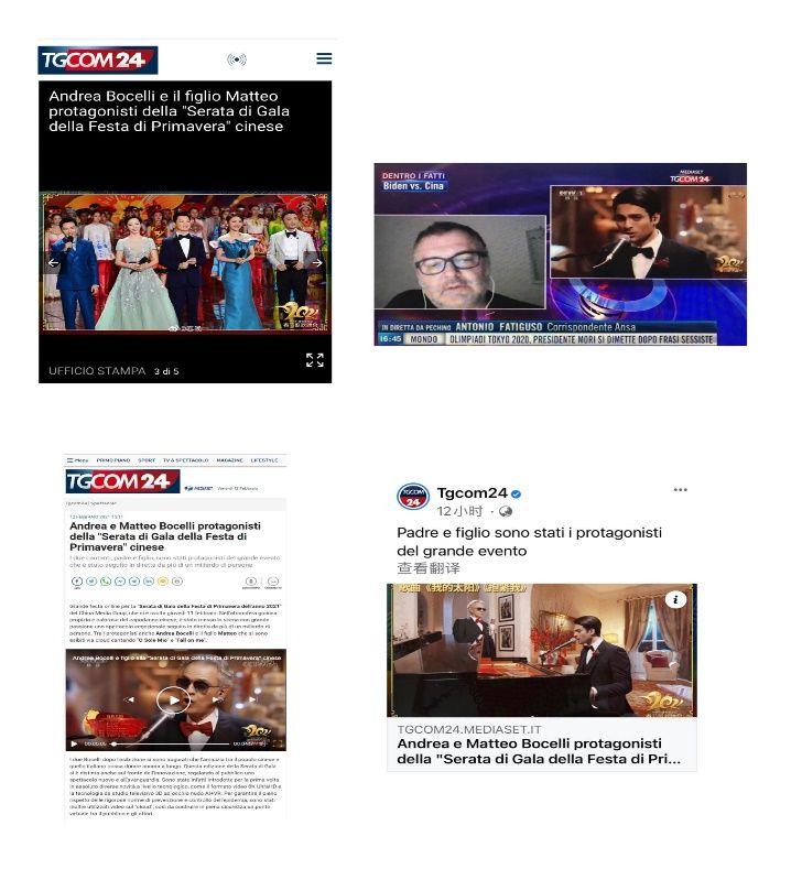 意大利重要的全国性报纸之一《日报》 在网站发表题为《波切利父子春晚献唱贺新春》 的文章。文章写道,中央广播电视总台春节联欢晚会以歌舞、小品等形式,将建党百年、疫情防控等主题生动呈现。意大利歌唱家波切利父子在晚会中演唱《我的太阳》等歌曲。意大利网友在社交媒体纷纷留言,表示愿中意两国人民友谊长存。意大利最大的电视台及新闻网站Tgcom24、意大利Teleambiente电视台在晚间资讯栏目、意大利全国性通讯社Primapress 分别发表了相关报道。