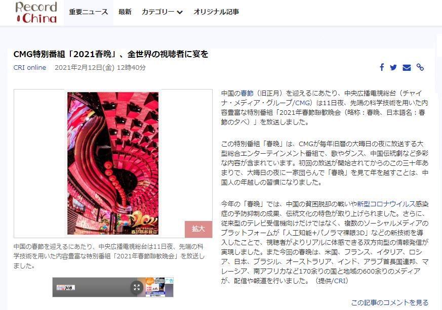 日本最大的中国资讯网站Record China 发布报道称,今年的春晚聚焦中国脱贫攻坚的成就、新冠疫情防控的战略性成果等,紧扣时代主题,同时充分展示了中国的传统文化。此外,新技术的应用也为观众们打造了一场令人震撼的视听盛宴。