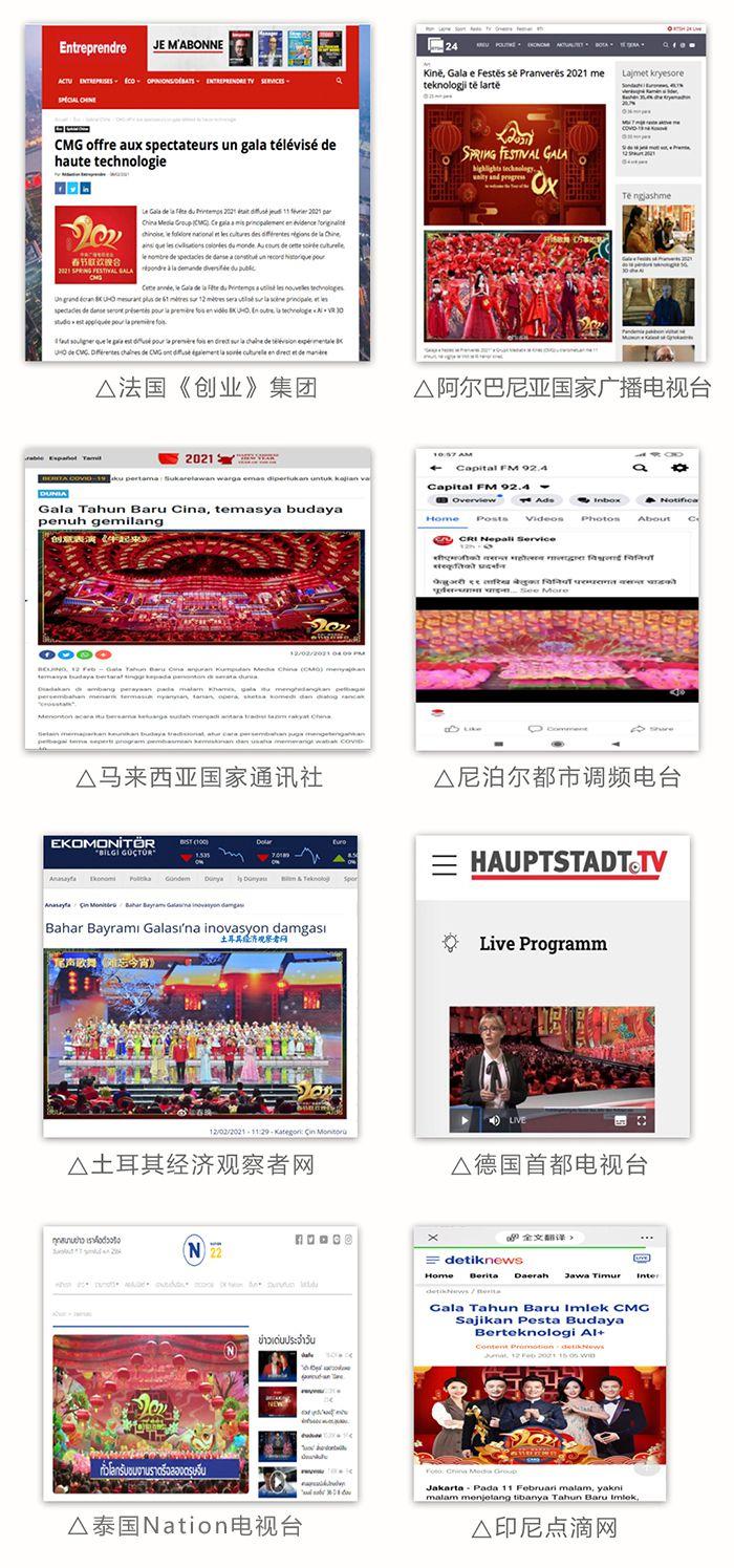 法国《创业》媒体集团网站、德国首都电视台、阿尔巴尼亚国家广播电视台官网、马来西亚国家通讯社、尼泊尔都市调频电台、土耳其经济观察者网、斯里兰卡国家电视台、泰国Nation电视台、印尼点滴网 等媒体高度评价春晚创新采用前沿技术手段,充分展示了总台“5G+4K/8K+AI”发展的最新成果。