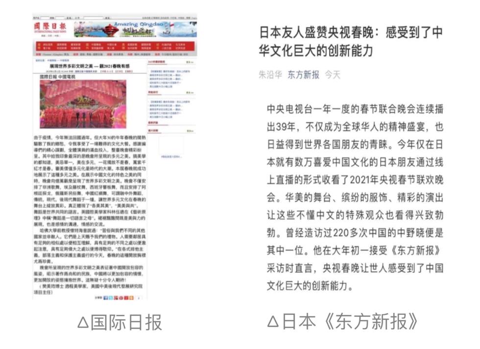境外多家华文媒体高度评价春晚盛况,美国《国际日报》 发表了题为《展示世界多彩文明之美——观2021春晚有感》 的文章表示,本届春晚在展示中国文化的特色之美的同时,向亿万观众呈现了世界多彩文明之美。日本《东方新报》 刊文表示,通过春晚日本友人感受到了中国文化巨大的创新能力及未来的无限可能。报道指出,当代中国对于优秀传统文化精粹的挖掘、继承、发展和传播所取得的成就令人瞩目。