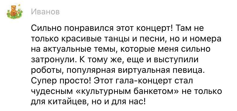 VK网友伊万诺夫 留言:“太喜欢这场晚会了!这里不仅能看到精彩的歌舞,而且还有很多反映时代主题的节目,令我深受感动。机器人和虚拟歌手的表演科技感十足,特别赞!这场晚会无论对于中国人,还是对于我们来说,都是一场美妙精彩的文化盛宴!”