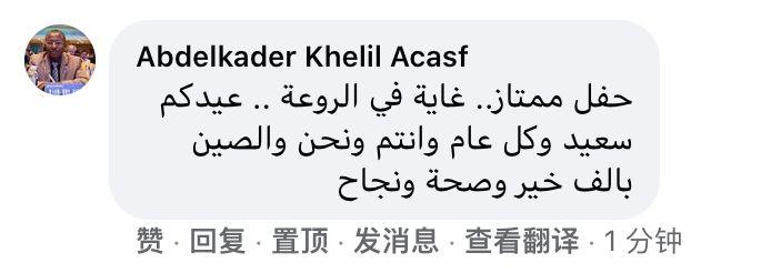 阿尔及利亚网友阿卜杜勒卡德尔·凯里尔·阿卡夫 留言:“一场很棒的晚会,非常精彩。新年快乐,希望新的一年我们和中国人民都有无尽的健康和成功。”