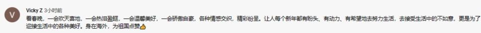 海外网友Vicky Z 留言:“看春晚,一会欢天喜地,一会热泪盈眶,一会温馨美好,一会骄傲自豪,各种情感交织,精彩纷呈。让人每个新年都有盼头、有动力、有希望地去努力生活,去接受生活中的不如意,更是为了迎接生活中的各种美好。身在海外,为祖国点赞。”
