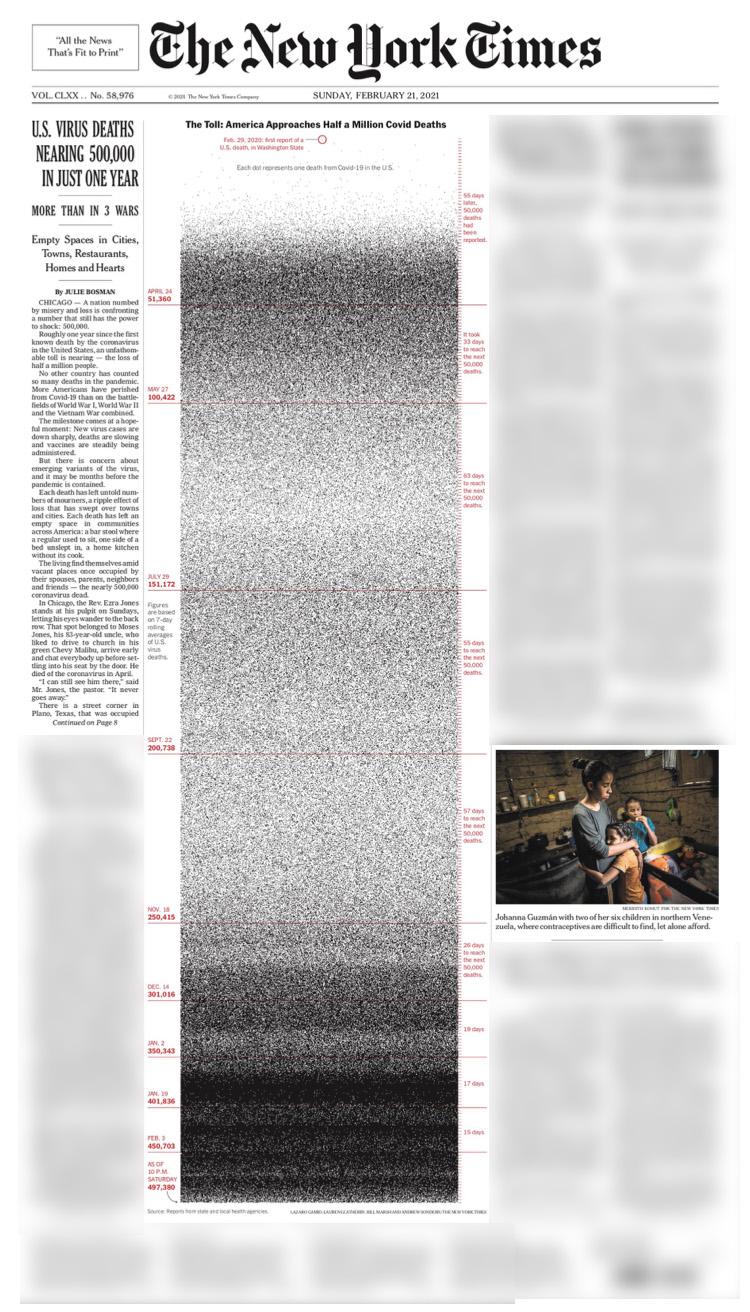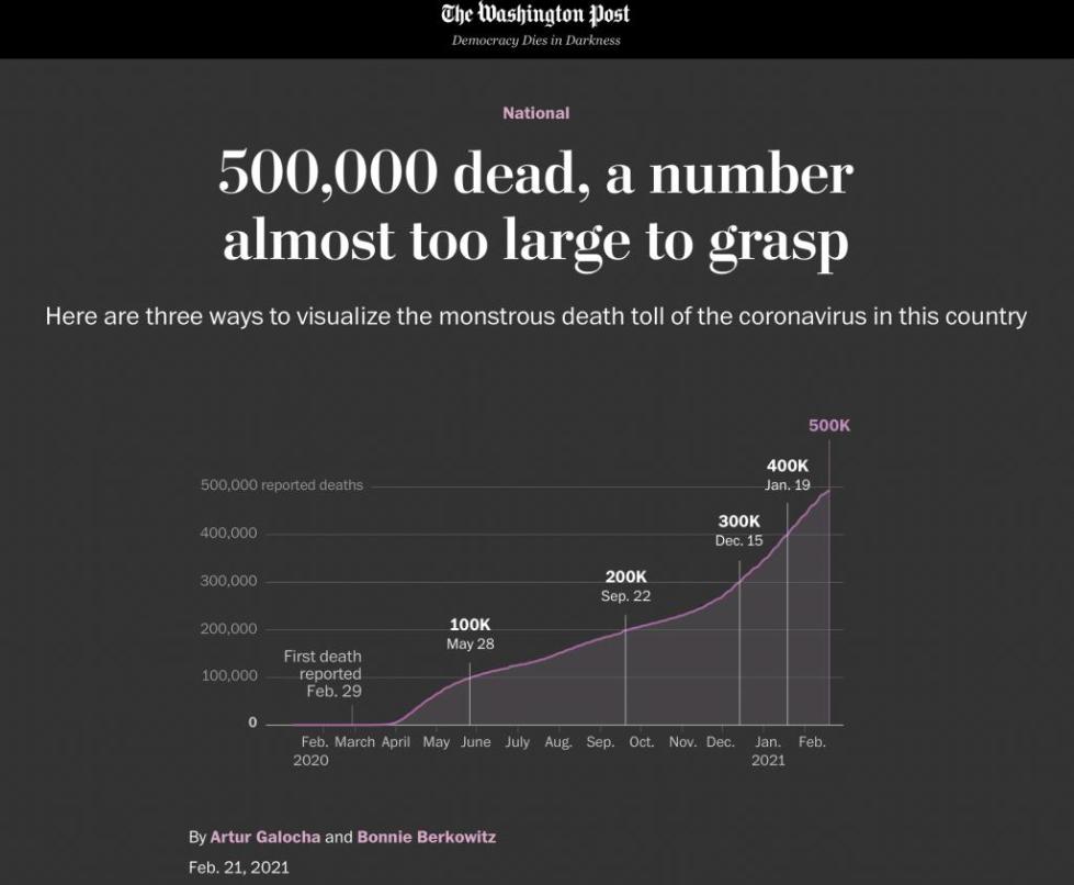 《纽约时报》2月21日的头版以大型点状图展示美国的新冠疫情悲剧,每一个黑点代表一条逝去的生命。从去年2月29日美国发现第一例死亡病例开始,近50万个黑点密密麻麻得布满一半版面。从时间轴可以看出,随着时间的推移,点状图上的黑点分布得越加密集,这意味着死亡病例增长速度不断加快,且在这个“黑色的冬季”出现剧增。