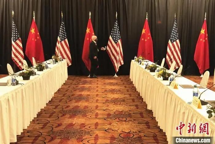 中美高层战略对话当地时间3月19日中午在安克雷奇结束。图为当地时间3月18日,工作人员为此次对话的首场会谈做准备。中新社记者 陈孟统 摄