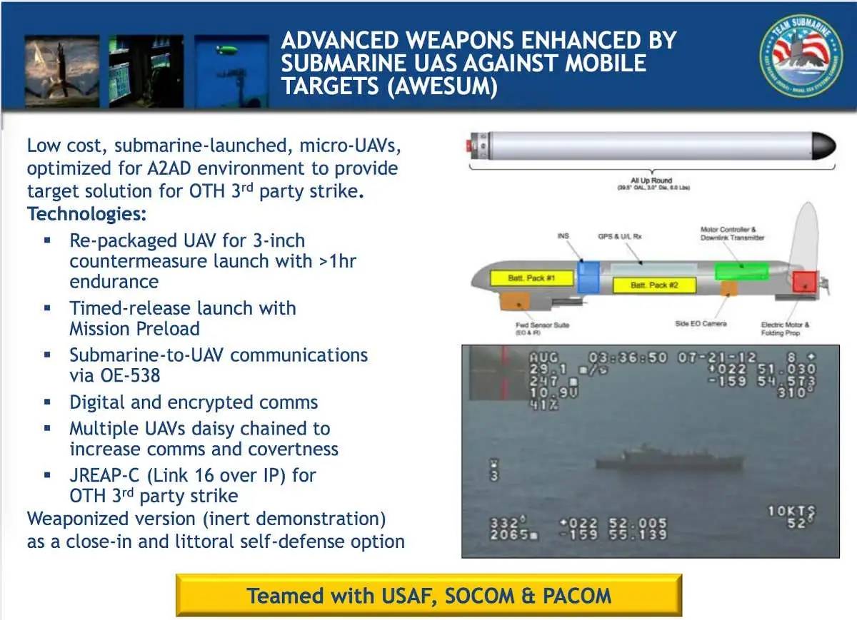 NAVSEA去年10月发布的一份公告明确了其对潜射无人机的技术要求。这份文件写道:“美国海军需要直径为3英寸(76.2毫米)的SLUAS,以提供增强的传感器、通讯和网络安全能力。该系统应能从军用潜艇的3英寸标准发射管发射……在空中飞行至少1个小时,在无线电通讯范围内操作,并使用至少256位的可变带宽加密数据链。”