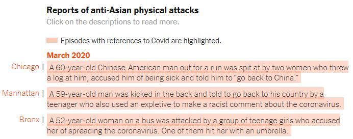 在这篇题为《愈演愈烈的反亚裔暴力:他们在这里受到攻击》的长篇报道中,《纽约时报》整合了2020年3月至2021年3月亚裔美国人遭受攻击骚扰的媒体报告。