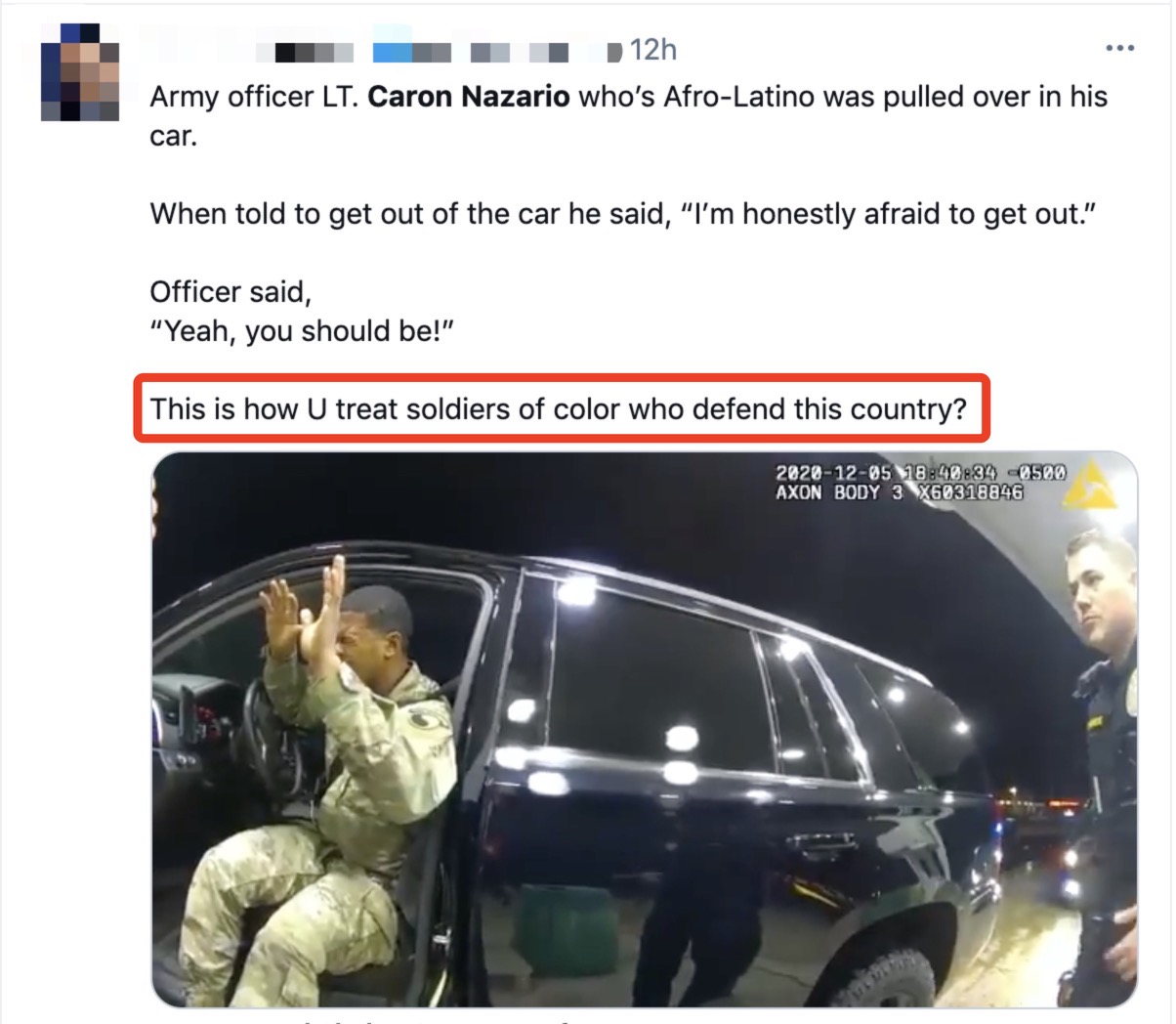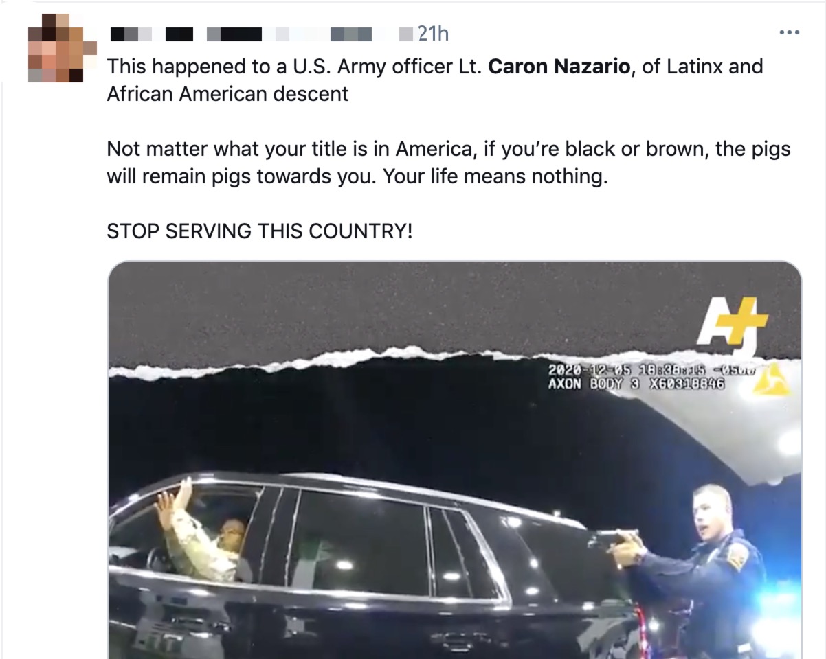 网民:“这就是发生在美国拉丁裔和非洲裔混血的陆军军官纳扎里奥身上的事。在美国,不管你的头衔是什么,如果你的肤色是黑色或棕色……你的生命就毫无意义。别再为这个国家服务了!”