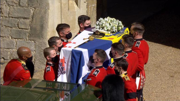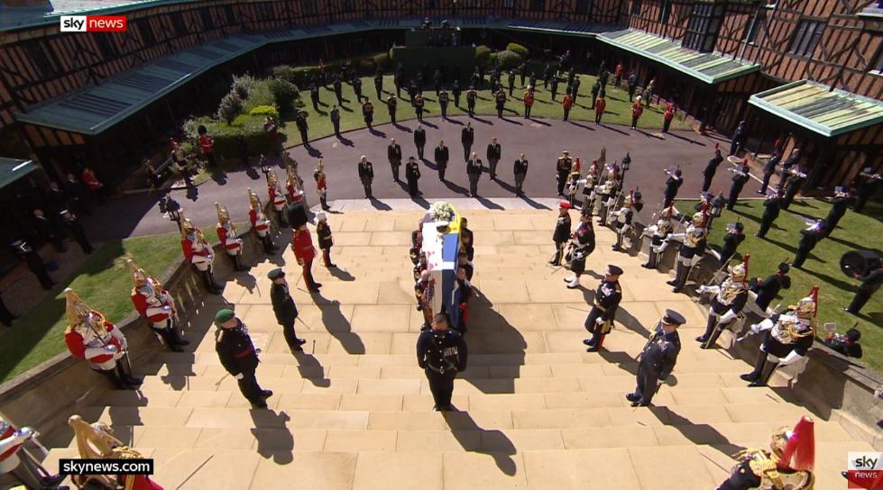天空新闻报道称,葬礼开始前,全英默哀一分钟。菲利普亲王棺木由一辆他参与设计改装的路虎车从温莎城堡运往圣乔治教堂,棺木上盖着他的公爵旗,配上花环以及菲利普亲王的海军帽和佩剑。葬礼仪式结束后,遗体将安葬在温莎城堡的皇家墓室。