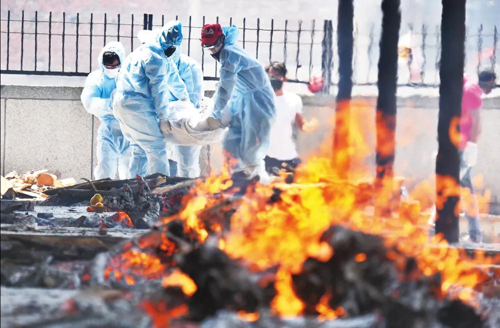 4月24日,印度首都新德里一座火葬场上空烟雾弥漫。泥土地上,用木板和树枝堆出的22个火葬堆熊熊燃烧,戴着口罩的工作人员将白布包裹的遗体抬上第23个柴堆。