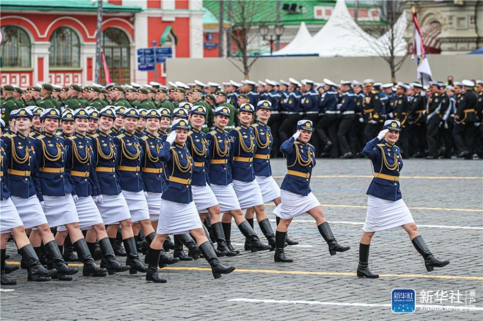 ↑5月9日,在俄罗斯莫斯科举行的胜利日阅兵式上,女兵列队走过红场。新华社发(叶甫盖尼·西尼岑摄)